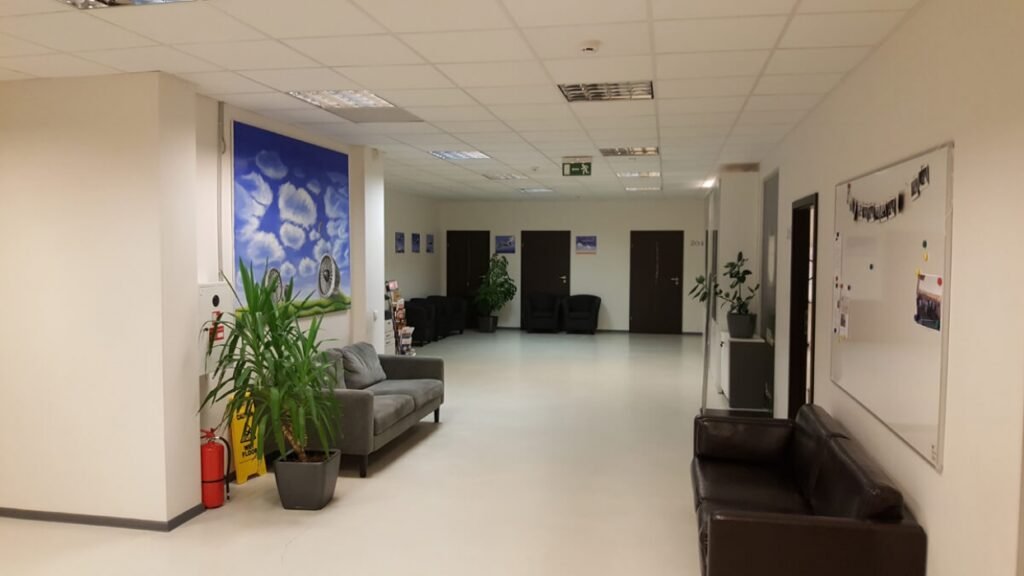 1729,7 kv. m., trijų aukštų administracinės paskirties pastatas. Patalpos yra šalia Vilniaus tarptautinio oro uosto, aplink įsikūrusios įvairios aviacijos, logistikos, gamybos įmonės. Patalpos visiškai įrengtos, jose įsikūrusi pilotų mokymo įstaiga. Tinka mokymo ir administracinei veiklai Patalpos šiuo metu yra išnuomotos.